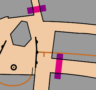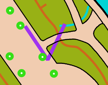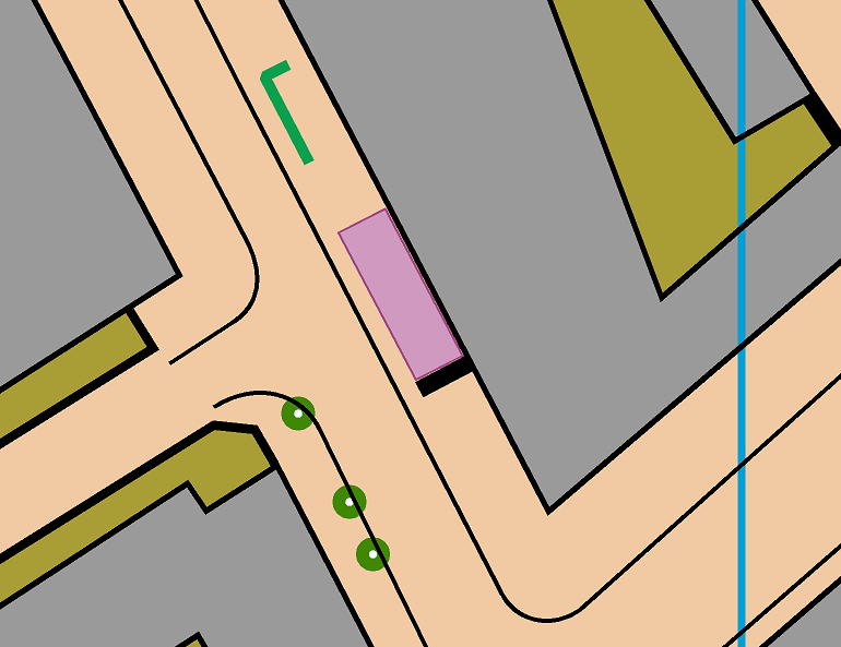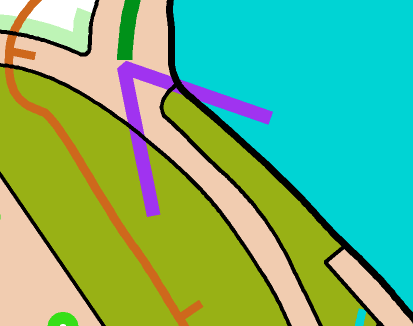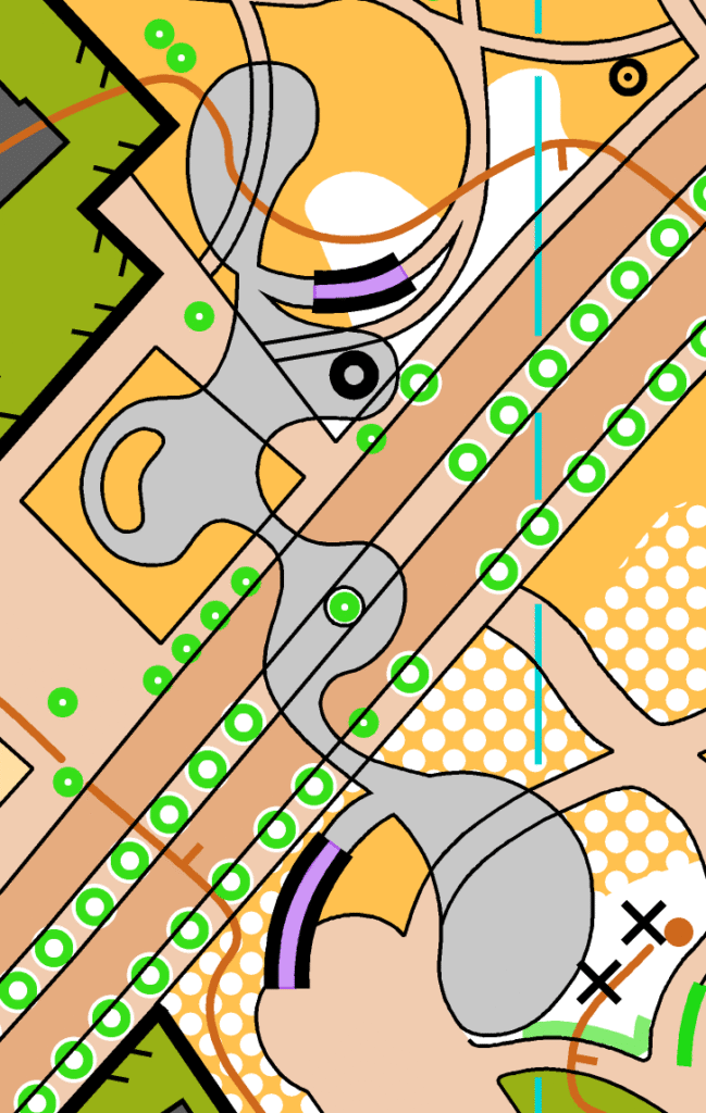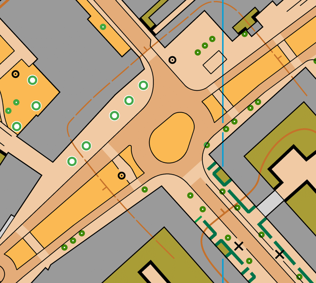 Conforme o ISSprOM 2019-2, as vias mais movimentadas foram desenhadas com o símbolo “501 – Paved area (heavy traffic)” (símbolo de pavimento mais escuro). Nessas vias as passadeiras estão assinaladas com o símbolo de pavimento mais claro, conforme imagem seguinte, de forma a auxiliar os atletas a perceberem onde será mais fácil realizar o atravessamento.