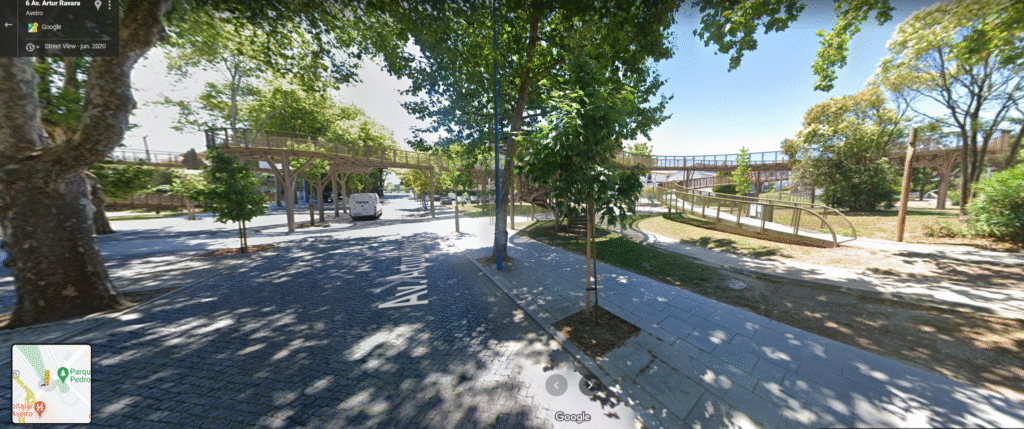 Entre os parques de Santo António e Infante D. Pedro existe uma ponte metálica dedicada à passagem de peões. Esta ponte tem duas zonas com 3 níveis de circulação e, por isso, é impossível desenhá-la segundo as normas ISSprOM 2019-2.