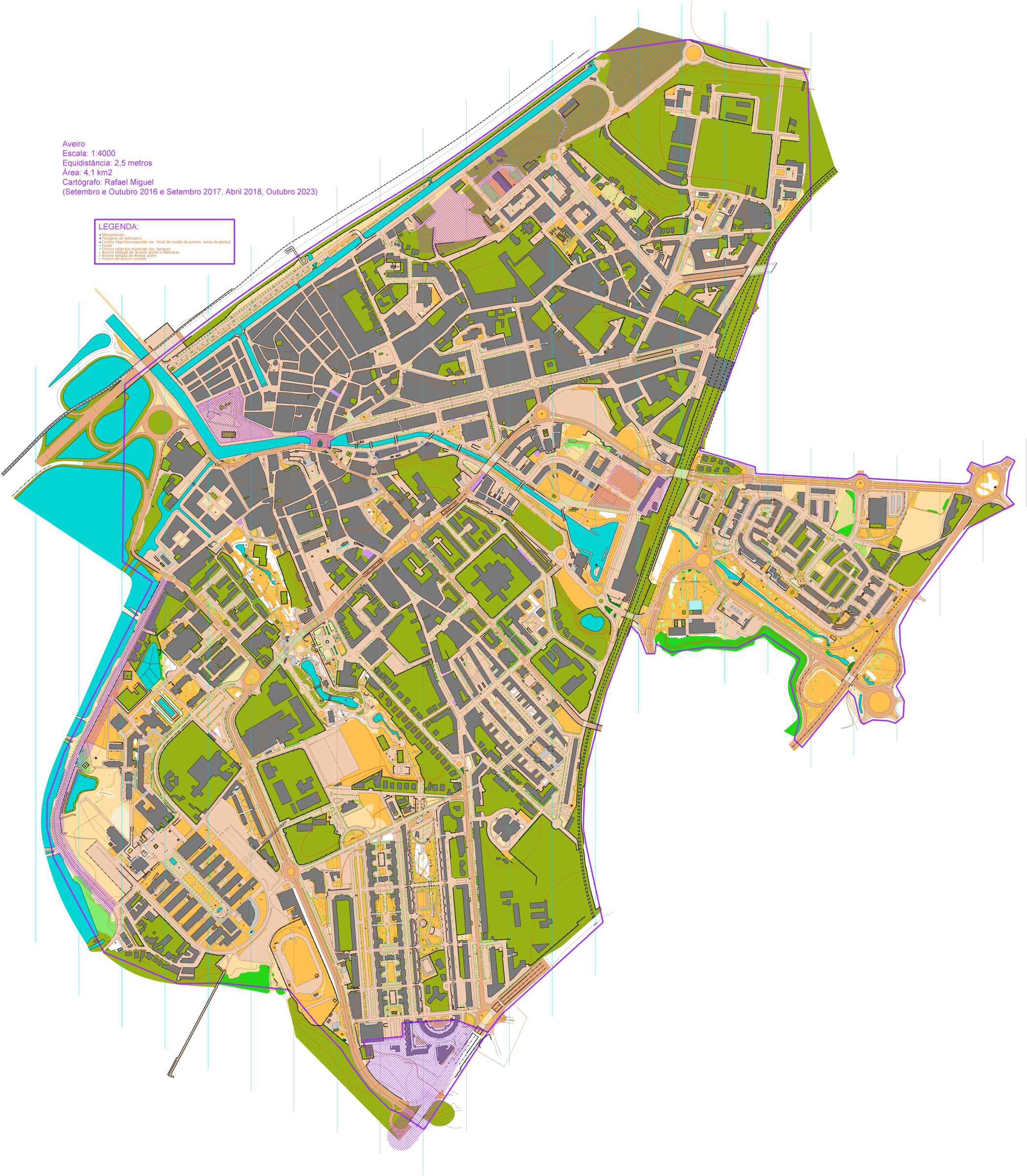 Mapa Urbano da Cidade de Aveiro, inicialmente cartografado em Setembro de 2016, tendo sido ampliado e actualizado ao longo dos anos. Este mapa utiliza a simbologia ISSprOM 2019-2 da International Orienteering Federation.